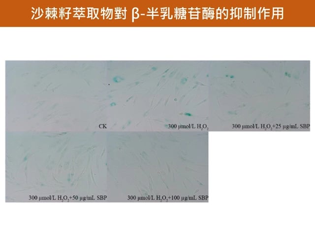 該實驗利用過氧化氫 (Hydrogen Peroxide) 誘導人類皮膚纖維母細胞 (Human Skin Fibroblasts) 產生氧化壓力,建構皮膚老化的體外模式,並藉以評估沙棘籽萃取物的抗氧化及抗老潛力。結果顯示,過氧化氫確實會對細胞產生氧化壓力,並導致細胞老化及死亡,而沙棘籽萃取物則能夠顯著改善此現象。