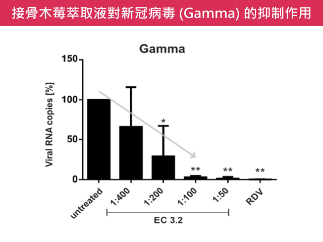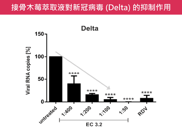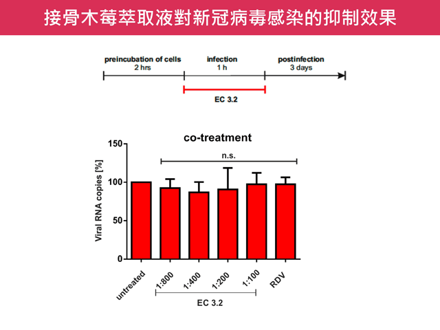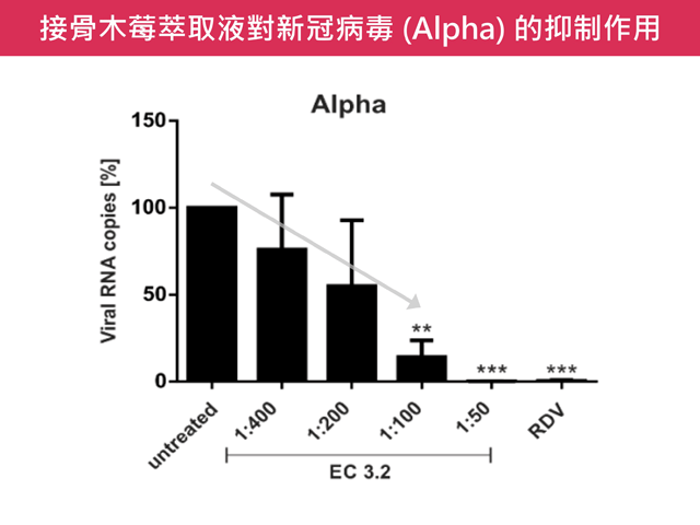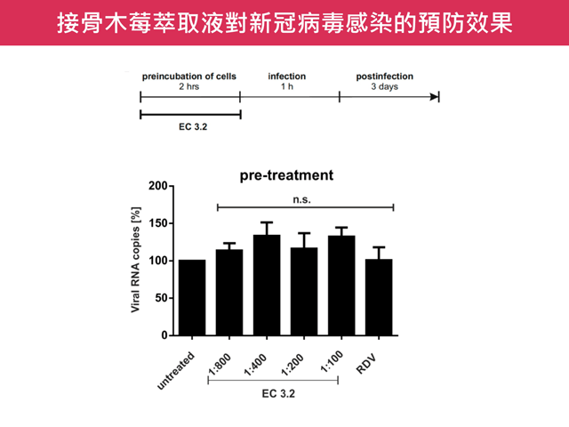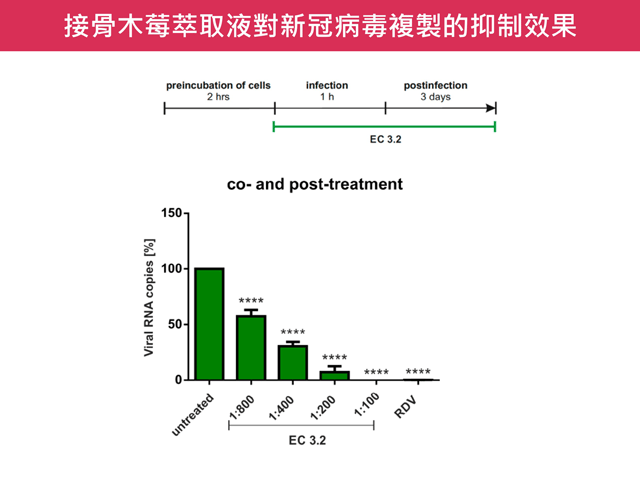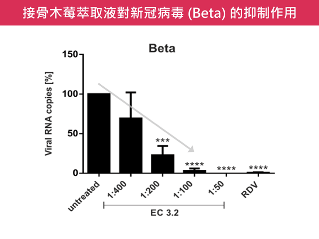 為探討接骨木莓的抗新冠潛力,德國愛爾朗根-紐倫堡 (FAU) 病毒研究所發表一項研究,證實接骨木莓具有抑制新冠病毒複製的效果。該研究以不同稀釋濃度的接骨木莓萃取液 (ElderCraft®),添加至感染原始病毒株的人類肺細胞 (Calu-3),並分析培養液中的病毒量。結果顯示,接骨木莓對病毒量的抑制有顯著的劑量關係,於 100 倍稀釋就幾乎阻斷了病毒後代的產生,而同系列的膜濾萃取粉也具有相同的作用 [5]。