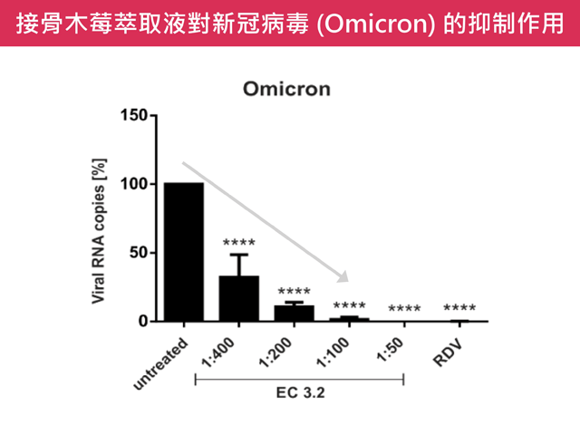 變種病毒是疫情延長賽的不確定因素,亦是醫藥開發的棘手難題。新冠病毒至今已有 Alpha、Beta、Gamma、Delta 及 Omicron 等變異株,其中以 Omicron 及其亞變種為目前主流。因此,該研究也針對不同變異株進行測試,評估接骨木莓的廣效性,發現 100 倍稀釋的接骨木莓萃取液,對這些變異株皆可達到約 9 成的抑制率。