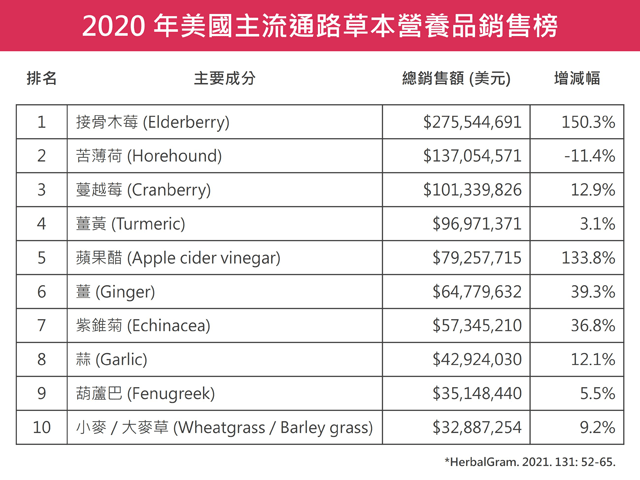 在疫情初期,因尚無治療或預防新冠肺炎的有效辦法,而使民眾紛紛將目光投向天然營養的輔助,藉以提升自我保護力。接骨木莓在其中脫穎而出,再加上美國流感季的爆發,讓接骨木莓產品的銷售額更節節攀升,於疫情期間登上美國草本營養品的熱銷冠軍 [4]。此外,美國功能醫學會 (IFM) 也將接骨木莓列入 COVID-19 輔助營養的推薦名單,但此基於過去抗流感的相關研究,對新冠病毒是否有用則仍不得而知。