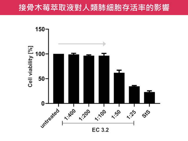 然而,病毒量減少亦可能是接骨木莓對細胞產生毒殺作用,也就是宿主細胞本身的數量減少。該研究進一步探究此可能性,發現接骨木莓萃取液在 100 倍以上的稀釋濃度,對細胞存活率皆沒有明顯影響,除了驗證其安全範圍之外,亦說明此劑量下的抗病毒作用與細胞死亡無直接關聯。