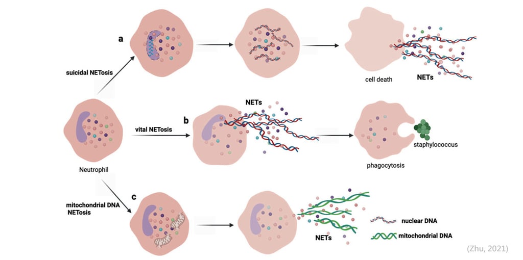 事實上,NETs 是嗜中性球的一種防禦機制,當外來病菌入侵時,嗜中性球即會釋放 DNA 至細胞外,形成所謂的 NETs 來捕捉病原體。然而,釋出 DNA 亦會造成嗜中性球死亡,有如自殺式攔截一般,因此這過程又稱為「釋網凋亡 (NETosis)」(3)。