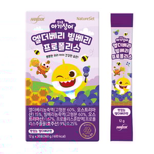 「接骨木莓蜂膠飲 (엘더베리 빌베리 프로폴리스)」是由韓國醫療保健大廠「Handok」公司旗下品牌「NatureSet」推出,並與知名的「碰碰狐與鯊魚寶寶」聯名,針對兒童免疫所設計的機能保健飲品。其主打採用奧地利接骨木莓與山桑子,並搭配澳洲頂級蜂膠、植物乳桿菌等素材,幫助維持兒童的免疫防護力。此外,此商品也不添加人工色素與香料,僅採用土耳其蘋果、智利紅白葡萄等天然果汁做調味,兼顧天然、健康與美味價值。