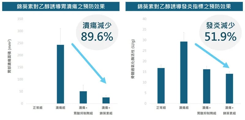 結果顯示,乙醇對胃部造成的潰瘍面積最大,將近是非類固醇消炎止痛藥的 9 倍,並暗示飲酒引發消化性潰瘍的風險較高。補充錦葵素則能夠顯著減少潰瘍面積,並降低胃部發炎指標-骨髓過氧化酶 (Myeloperoxidase, MPO) 活性。概略來說,於乙醇與非類固醇消炎止痛藥誘導的胃潰瘍模式下,錦葵素對潰瘍的抑制率分別達到了 89.6% 及 63.8%。