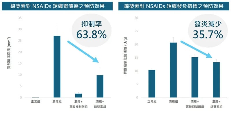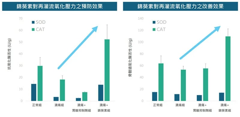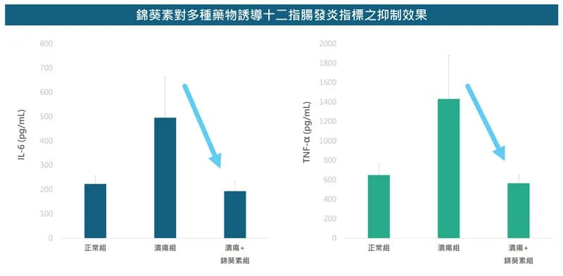 此外,醋酸誘導胃潰瘍的程度相對輕微,而錦葵素與胃酸抑制劑則具有相似的保護效果。值得注意的是,於缺血再灌流的模式下,器官會因為血流中斷再恢復,而引起劇烈的氧化發炎反應。不論是事前或事後給予,錦葵素皆能提升 SOD 與 CAT 等抗氧化酶的活性。另一方面,在多種藥物誘導十二指腸潰瘍的模式中,同樣觀察到錦葵素能夠抑制 IL-6 及 TNF-α 等發炎指標。據此可知,錦葵素可能透過提升抗氧化力、抑制發炎反應,而達到預防潰瘍及促進傷口修復的效果。