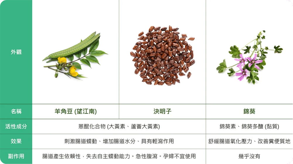 以番瀉葉、羊角豆與決明子為例,它們主要的助瀉成分皆為蒽醌化合物,如番瀉苷及蘆薈大黃素。這些成分能夠刺激腸道平滑肌蠕動,並透過滲透壓使水分滯留,最終達到腹瀉的效果。然而,其隱憂除了腸道依賴性之外,甚至有可能引發所謂的「黑腸症」,而某些蒽醌化合物亦有造成孕婦流產的風險。