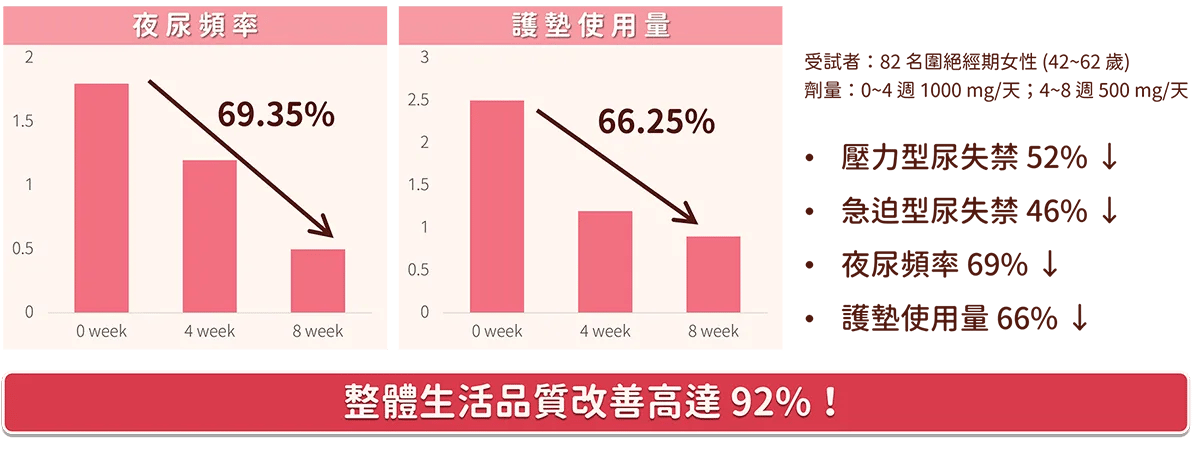 為了守護女性的健康、尊嚴與自信,西班牙醫藥大廠 Tradichem S.L. 以嚴謹的科學基礎,經多年的原料篩選、比例調配及科學驗證,最終開發出較適合產後及更年期婦女的止漏方案-Dropsordry® 蓓滴淨複方植萃 [2]。經過 8 週臨床試驗,發現 Dropsordry® 能夠助改善受試者的尿失禁症狀,不論是壓力型或急迫型尿失禁的發生次數皆顯著減少,並且大幅降低夜尿頻率及護墊使用量。白天不再急於找廁所,夜間也不需要頻繁起床,整體生活品質提升達 92%!